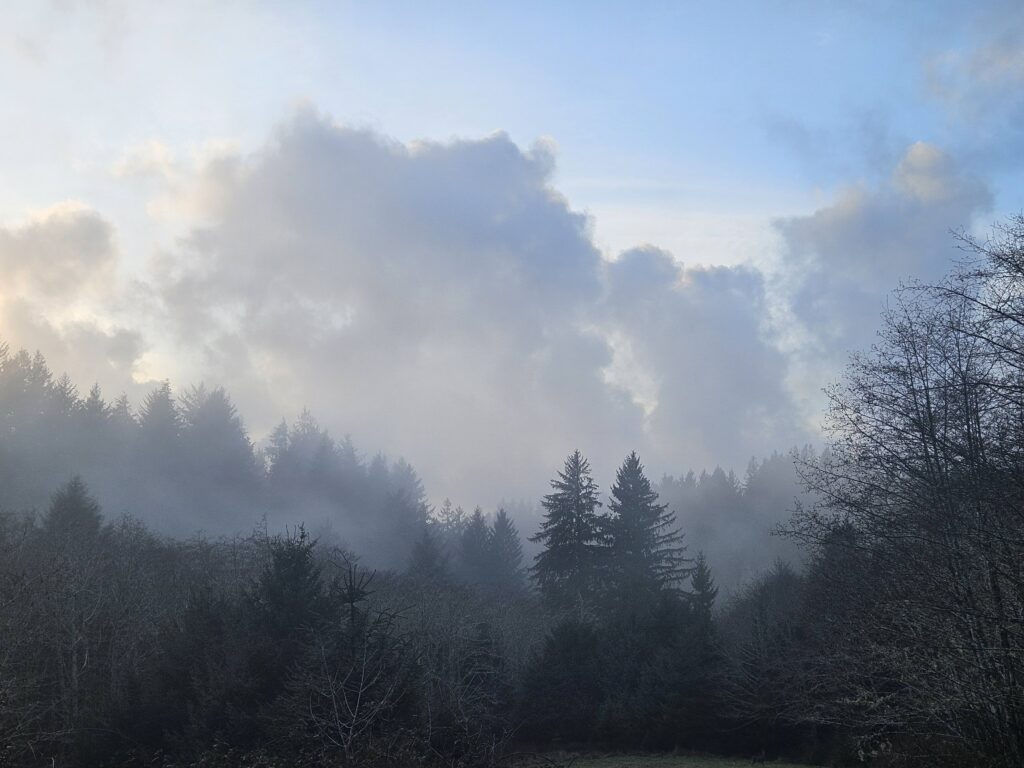 A photographer steps out and squints into the light. A lamp clicks on in the writing studio. On the headland, a thin skiff of snow lingers in the shadowed grasses from earlier in the week, softening at the edges as the morning warms. Elk pick their way through the frost where the sun has not yet reached. The trails are damp. The light is thin.