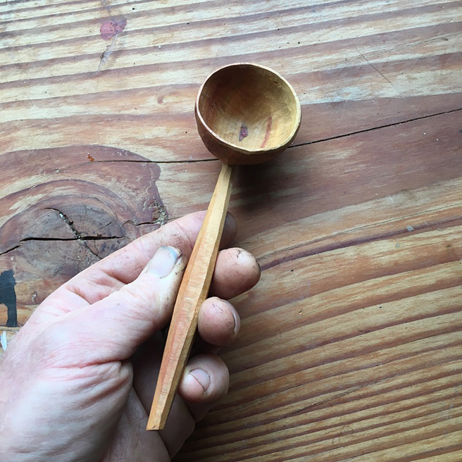 After college, he worked professionally for 10 years in various aspects of community development. When he “went back to art,” new teachers introduced him to the fact that, at root, art just means “to fit together.” Whether one drives truck, teaches school, programs computers, or “makes art,” one has to fit one’s life to the beauties that give one life. Beauty means not just flowers and fruit. As with plants, so with life; beauty has roots deep in the soil; it feeds on the light of the sun, and on every aspect of our living and dying, light and dark. Our modern notion of Art, however, tends to separate beauty from daily life, elevating its purpose above mundane acts of living. By contrast, spoons offer a small but significant step towards re-combining meaning, purpose, beauty, and art. Integration makes life more whole. Carving spoons and making wares of wood brings him back into that story, and gives him a way to share it.