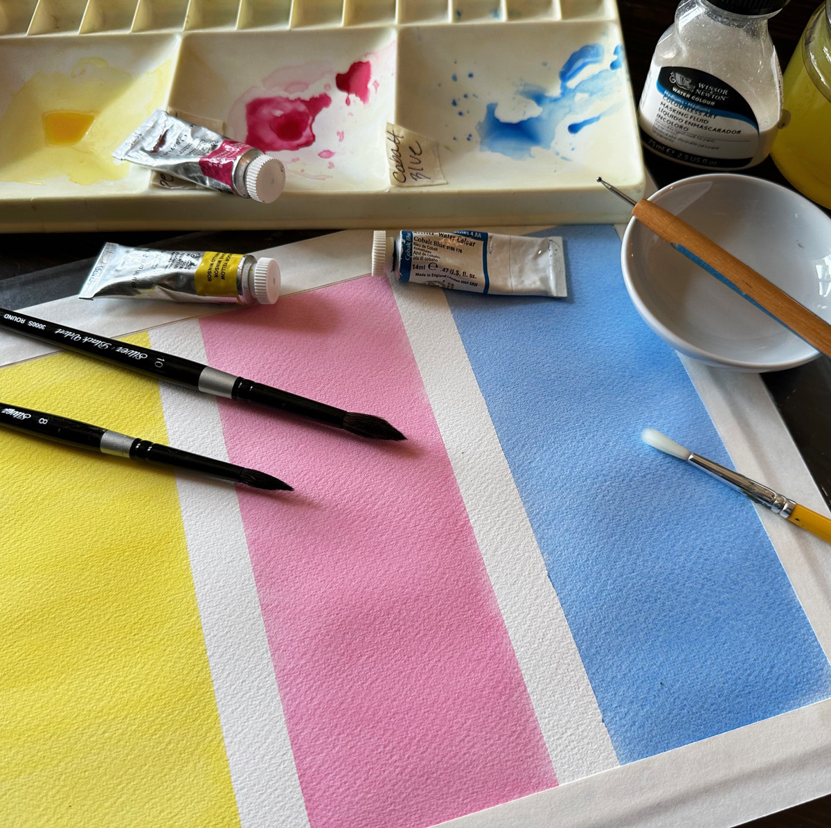 Watercolor tube paints, specifically Cobalt Blue, Permanent Rose, and Winsor Yellow, will be used for practice exercises. If participants already have a blue, pink or red, and any bright yellow watercolors they would like to use, they are welcome to bring them along. Patty mostly uses Winsor Newton and Daniel Smith brands, but other brands are acceptable.